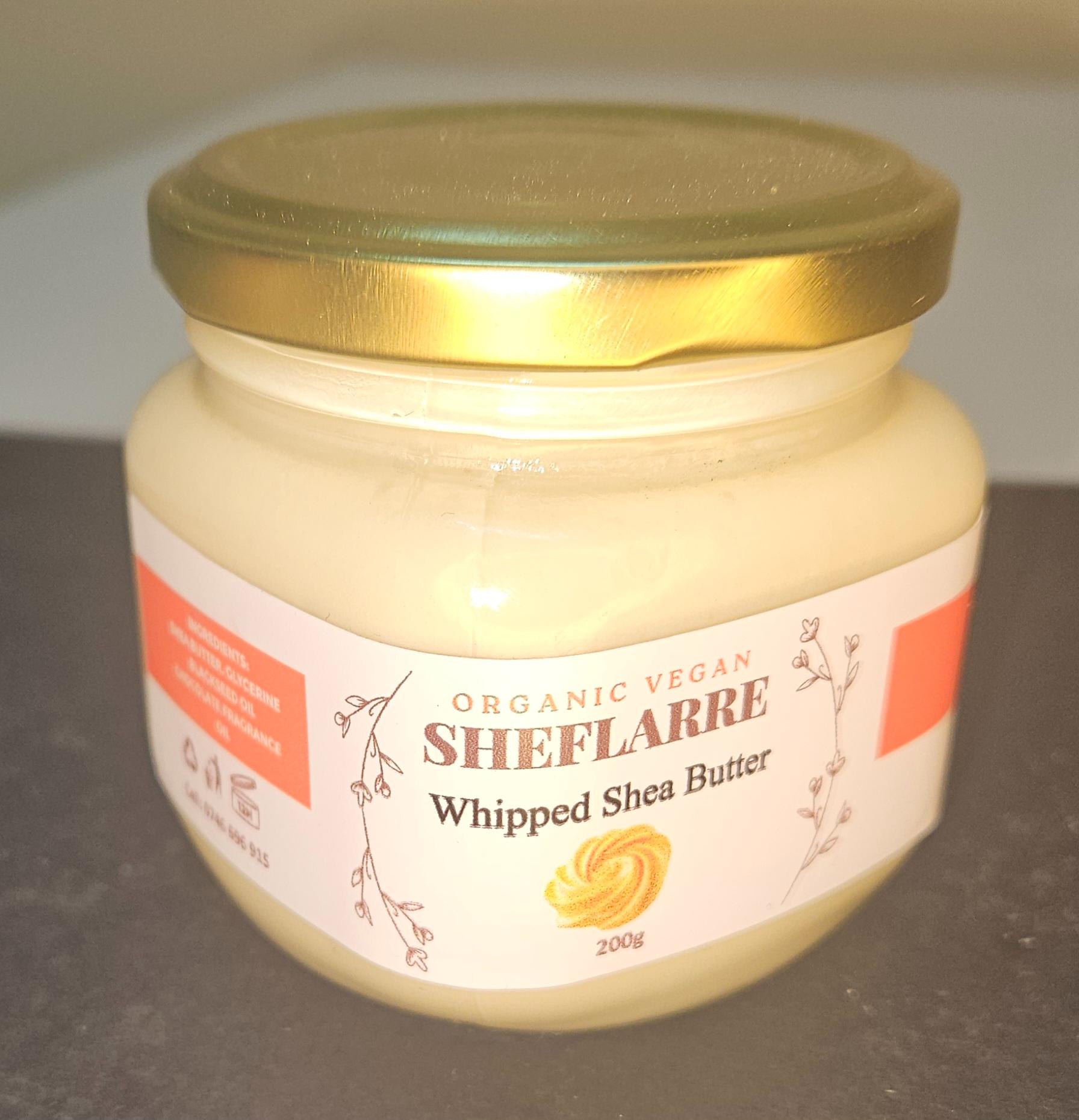 "SHEFLARRE is a premium organic skincare brand crafted to nourish, protect, and heal your skin. Our whipped shea butter is enriched with black seed oil and glycerine, offering deep hydration while strengthening the skin barrier. With natural sun protection properties, it helps shield your skin, soothe acne, and combat dryness. Infused with your choice of strawberry, vanilla, or chocolate fragrance oils, SHEFLARRE delivers a luxurious skincare experience that leaves your skin soft, smooth, and radiant. Elevate your skincare routine with the power of nature and indulgence!"