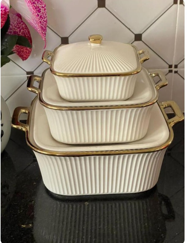 Gold Rim serving dish set Has three shapes, round hexagon square capacity 2 ltrs,1 ltrs and 0.5 ltrs